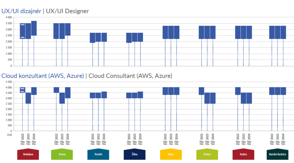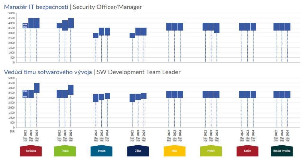 Na nadštandardnú čiastku vyššiu než 4 000 eur mesačne môže vo všetkých krajoch na Slovensku dosiahnuť taktiež softvérový alebo cloudový architekt, vysoké mzdy sú aj pri rôznych konzultantoch (SAP, AWS, Azure, Security) či v oblasti IT bezpečnosti a tiež pri dátových a biznis analytikoch a vývojároch, pri ktorých bola na všetkých pozíciách zastúpených v prieskume horná hranica mzdového rozpätia v Bratislave minimálne 3 500 eur. Naopak, najmenej zarábajú špecialisti technickej podpory (napríklad v Prešove je mzda špecialistu technickej podpory 1. stupňa 1 400 – 1 700 eur) alebo manuálni testeri (v Prešove, Nitre, Košiciach a Banskej Bystrici 1 500 – 2 000 eur, v Trenčíne a Žiline 1 600 – 2 100 eur, v Bratislave a Trnave 1 600 – 2 500 eur).
