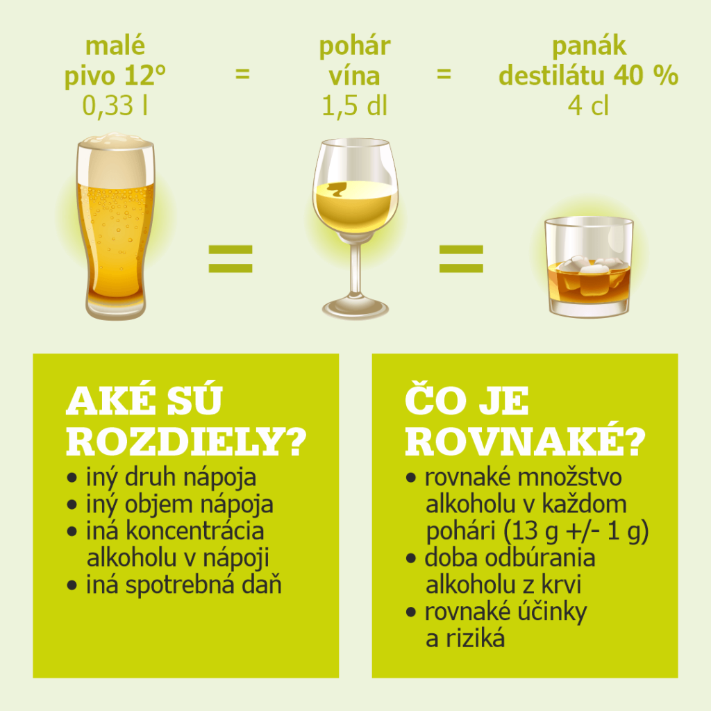 Najčastejším omylom pritom podľa prieskumov občianskeho združenia je, že z piva sa človek v podstate neopije a už po polhodinke môže smelo sadnúť za volant. Skutočnosť je však celkom iná. Malé pivo 12°, pohár vína aj panák 40° destilátu obsahujú rovnaké množstvo alkoholu (13 g +/- 1 g). Takže keď si niekto dá veľké pivo, prijme v podstate o štvrtinu viac alkoholu, ako keby si dal 4 cl pohárik vodky.
