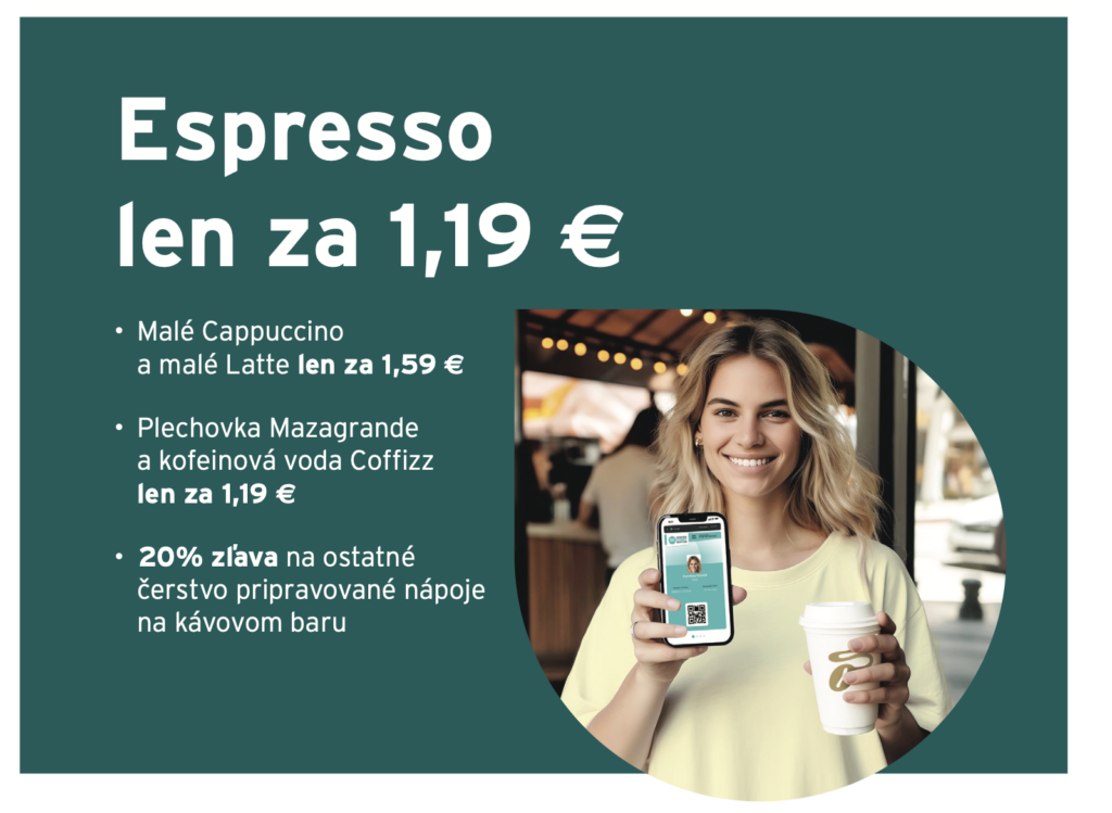 Na kávových baroch v predajniach Tchibo si študenti môžu s preukazom ISIC, ITIC a EURO<26 vychutnať kvalitné espresso a caffé crema už od 1,19 eur. Malé latte ich vyjde len na 1,59 eur a rovnako tak aj malé cappuccino. „Lacnejšie si kúpia aj osviežujúce nápoje Coffizz a Mazagrande, ktoré študentov po preukázaní sa niektorým zo spomínaných preukazov vyjdú len na 1,19 eur,“ dodáva Steffen Saemann. Oba nápoje sú povzbudzujúce ako káva, podporujú koncentráciu, zaženú smäd a príjemne osviežia. Študenti ich určite uvítajú najmä v skúškovom období, pretože obsahujú kofeín.